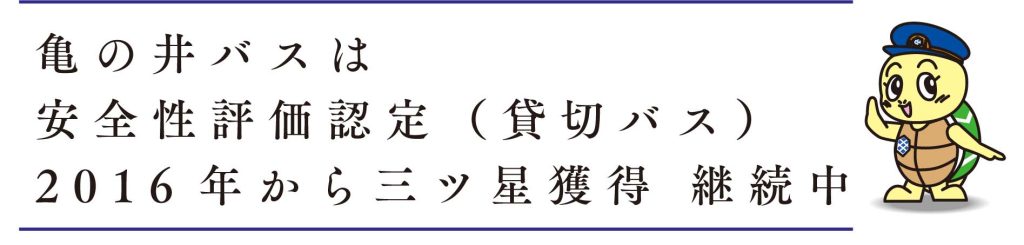 亀の井バスは公益社団法人日本バス協会が定めた安全・安心な安全性評価認定(貸切バス)3ッ星を取得、継続中です。